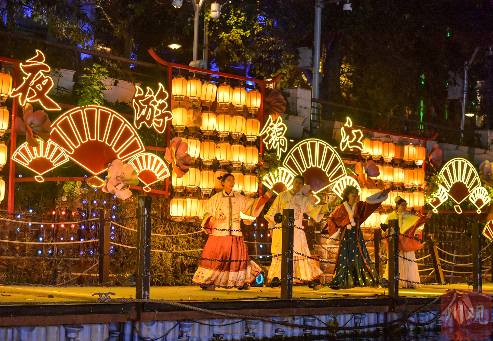 锦江河岸边的演员为乘坐游船的游客表演节目嘉创配资。
