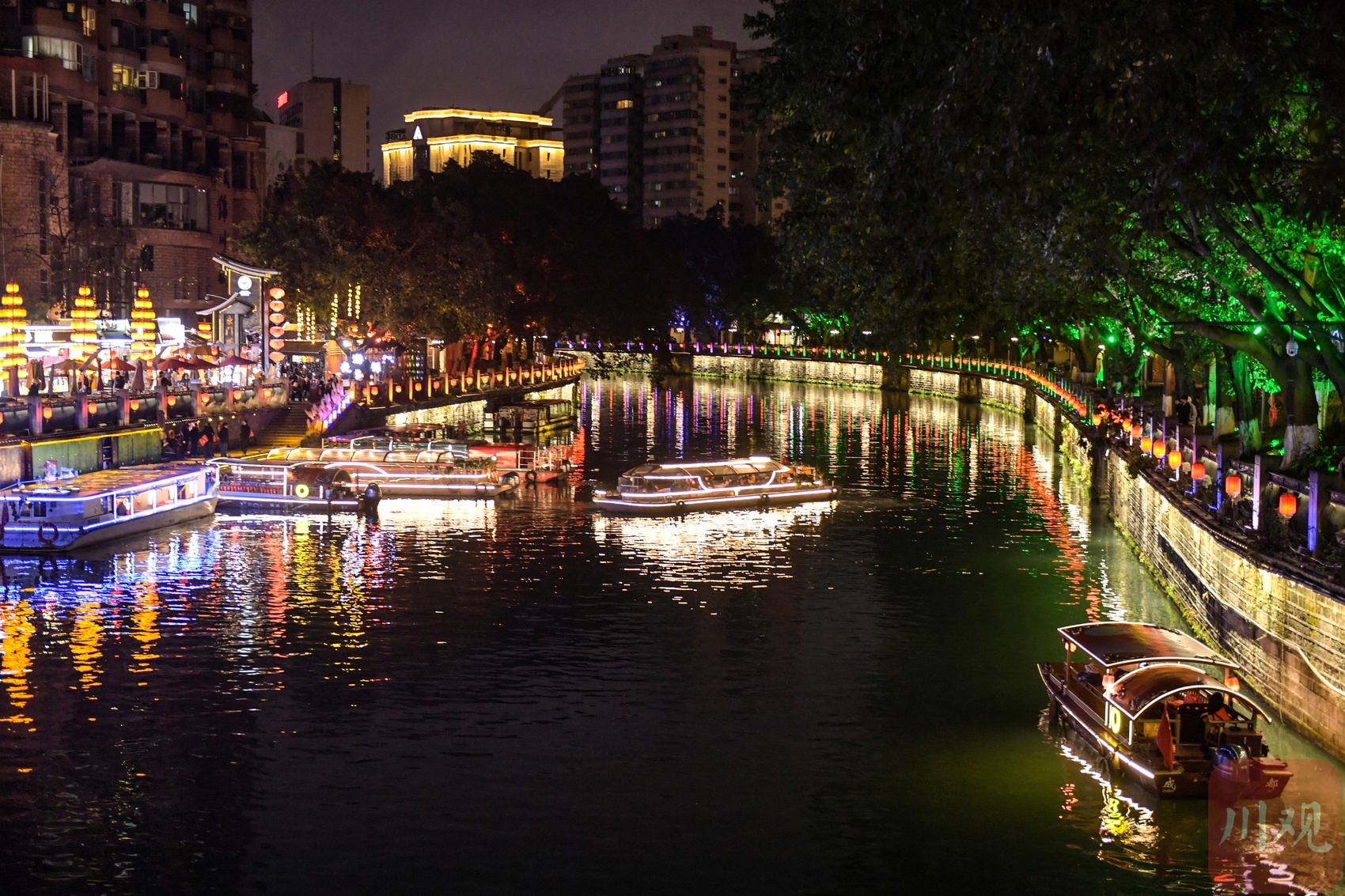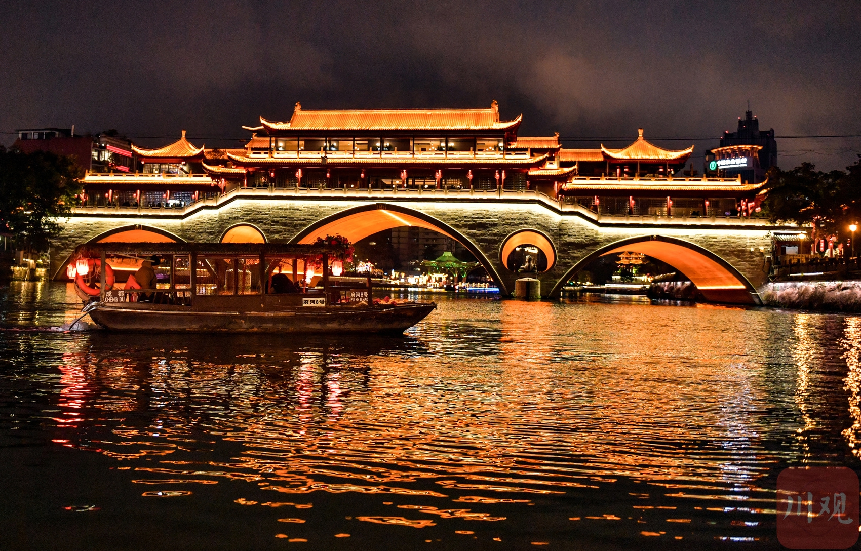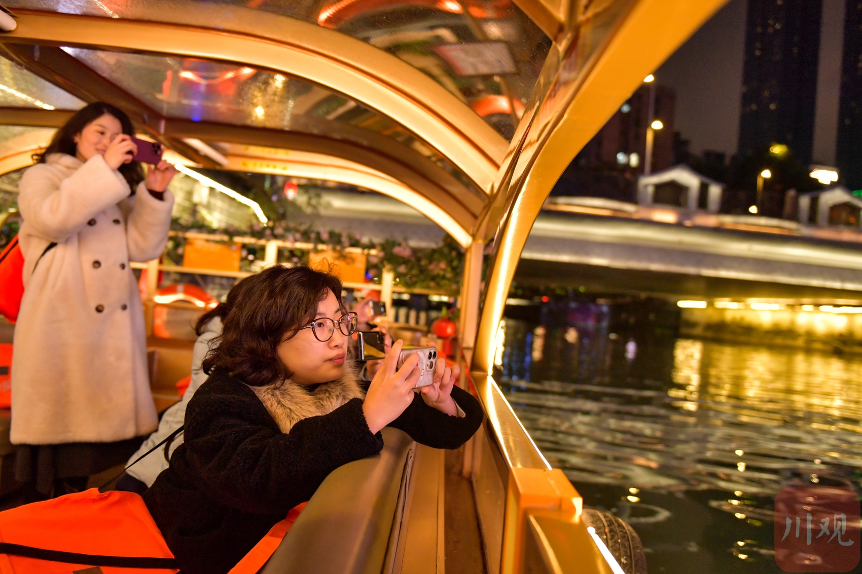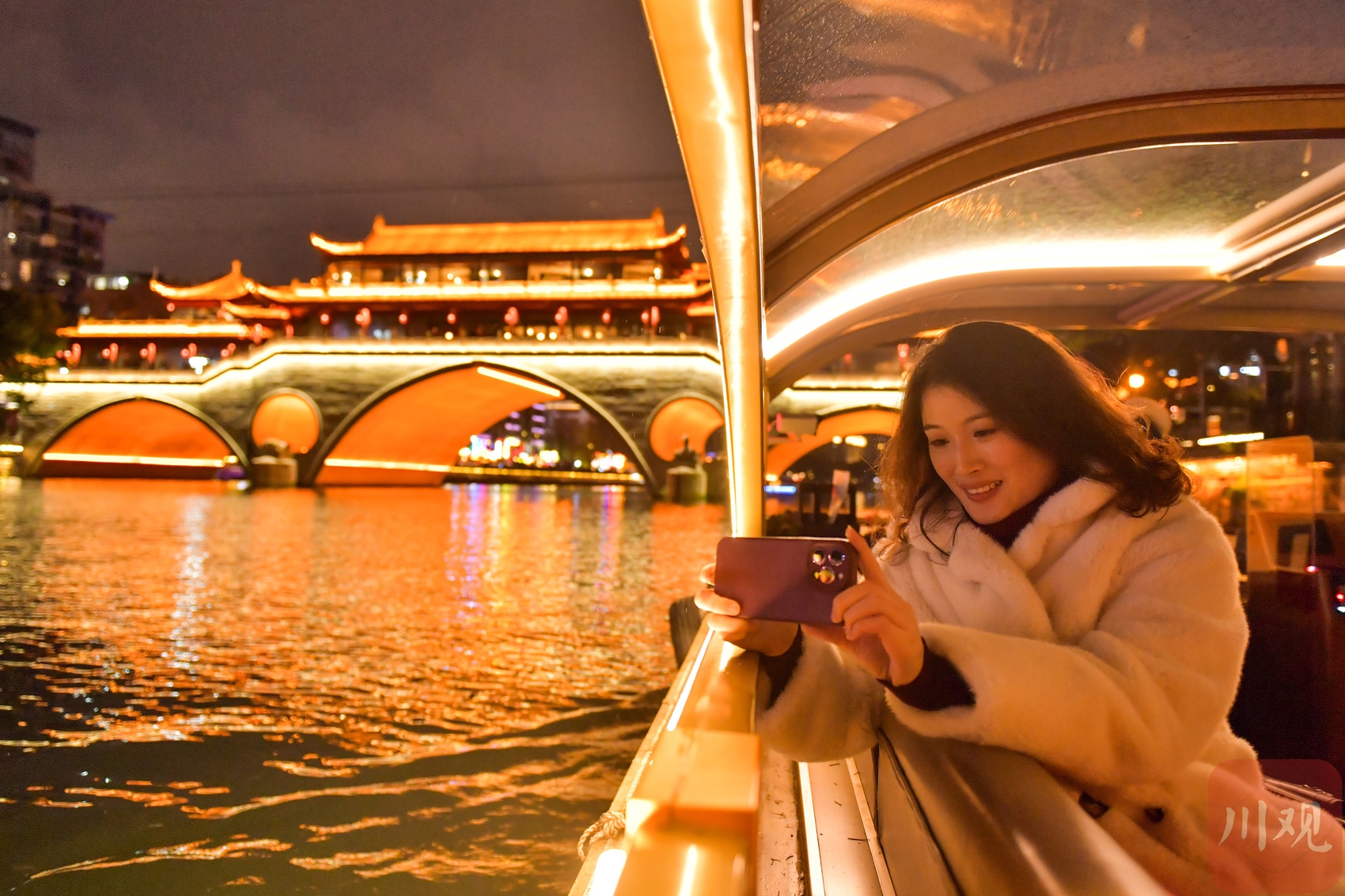 游客乘坐游船欣赏成都夜景。