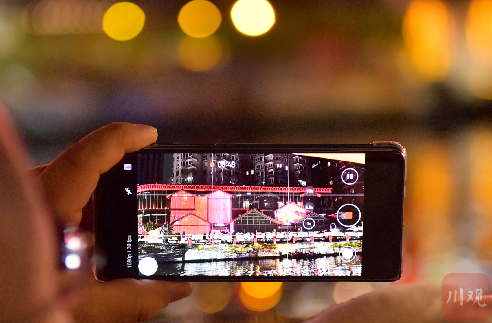 游客在游船上用手机记录成都锦江两岸风景。